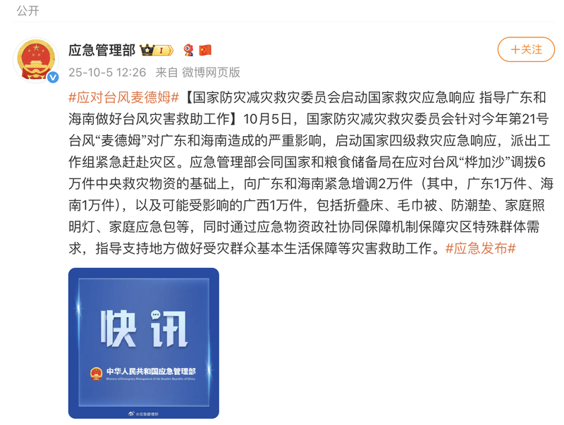 北京新闻根据紧急事务管理部的报道,10月5日,全国预防,减少和救济委员会发起了全国第四级紧急灾难响应,以回应今年的严重风暴,即广东和海南,并派遣一个工作组来赶紧该地区。基于对60,000份中央救灾材料的分配,以应对“ Bragaza”风暴,包括州和谷物局在内的紧急管理部和谷物保护区,立即确认照明,紧急家庭工具包等。同时,通过紧急材料和紧急材料和灾难地区的特殊团体需求可以保证政府合作的合作负责人 - 政府 - 政府 - 政府 - 政府 - 政府合作 - 合作 - 合作 - 司机 - 政府 - 务业 - - 合作 - 合作 - 合作 - 期间 - 期间 - 期间 - 期间 - 合作 - 合作 - 居住 - 居住 - 居住 - 居住 - 居住在 - 居住 - 访问 - 合作保证机制,并保证并支持地方政府做好灾难工作,以便造成灾难性的补救措施,例如受影响人民的基本安全安全。编辑Mao Tianyu