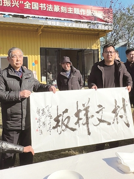 楚天都市报集目讯(记者周萍英、实习生张涵文、通讯员范小青、周洋、李树萌)“模范模范”四个大字签名盖章,赢得阵阵掌声。 11月19日,在襄阳市香州区玉山镇金寨村书法活动现场,七十多岁的郭家忠老人刚完成作业,就被“讨要书法”的村民围住。
