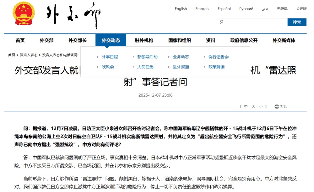 问:据报道,12月7日凌晨,日本防卫大臣小泉进次郎召开记者会,称歼15战机12月6日在冲绳郊外公海两次被福里尔F-15战机击飞,下午的报道“是战机安全飞行所必需的”,并对此提出“强烈抗议”。中国军方已就此问题表明立场。显然,日本战机当前形势下,日方炒作所谓“雷达曝光”问题,颠倒黑白、加剧紧张局势、误导国际社会,完全是别有用心,我们强烈反对。干扰中方正常训练活动,停止一切不负责任的虚假炒作和政治操弄。网站截图