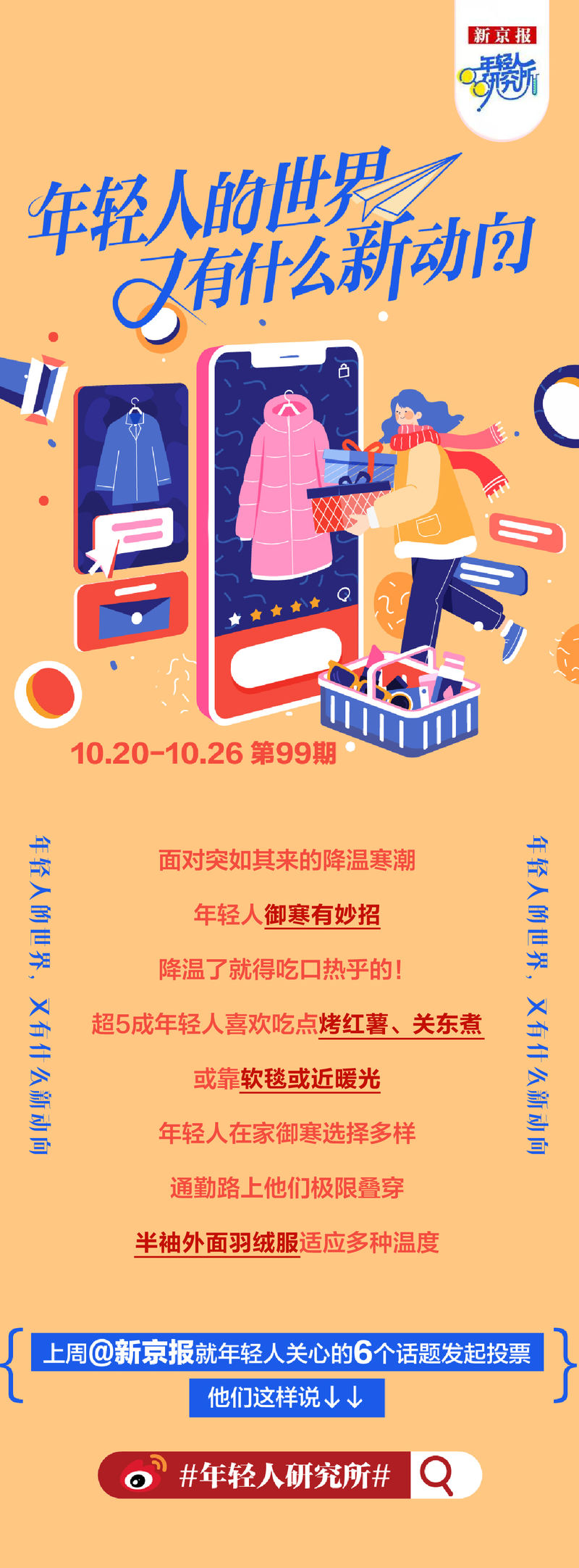 面对突如其来的降温浪潮,年轻人有一些御寒小窍门。吃点热的东西降温吧!超过50%的年轻人喜欢吃烤红薯、关东煮,或者靠在柔软的毯子上或者靠近温暖的灯光。青少年在家中可以采取多种预防感冒的方法。通勤时,他们极端地穿着半袖外羽绒服,以适应不同的气温。上周新闻针对年轻人关心的6个话题发起了民意调查。他们是这样说的↓ gan策划编辑张玉和、艾正设计赵乃斯、卢子雄校对李丽君