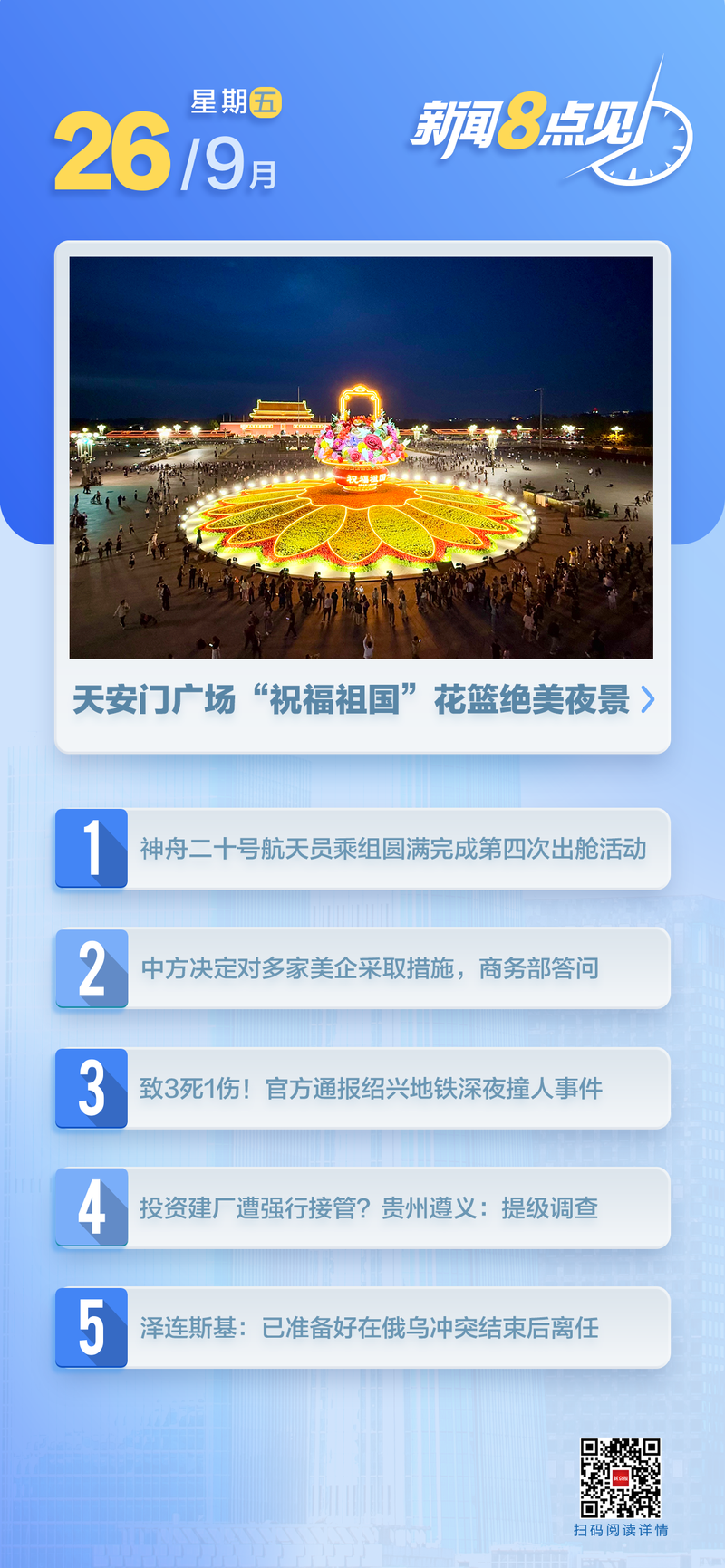 [Current affairs] The Shenzhou 20 Astronaut Crew successfully completed the fourth out-of-cabin event at 1:35 Beijing Time on September 26, 2025. After about 6 hours of out-of-cabin event, the Shenzhou 20 astronauts Chen Dong, Chen Zhongrui and Wang Jie Closly Cooporated and with the Cooperation and Support of the Space Station Robotic Arm and Ground Scientific Researchers, The卡宾(Cabin)既定的任务已经成功完成。 Cabin宇航员Chen Zhongrui和Wang Jie回到了Wentian实验室安全,而Cabin Out-Cabin活动取得了成功。 。国防部:我们希望不太遥远的那一天。在25日举行的国防部常规新闻发布会上,一些媒体询问是否会尽快提供福建船。作为回应,国民卫生部发言人张小大说,福建船测试培训按计划良好,我们希望不要太远。 zHang Xiaogang说,基于福建船的J-15T,J-35和KJ-600第三类飞机的弹射,降落和着陆培训标志着富士船具有电磁弹射弹药,并且基于空调飞机的空调飞机在飞机中基于飞机的飞机的飞机和乡村的乡村,并在飞机中恢复了空调飞机的空调飞机。 。国防部:菲律宾将警告停止山沟并阻止中国发起“不可靠的实体名单”,以惩罚台湾涉及的三家武器销售公司。商务部在不可靠的生物列表中对三家美国公司的商业商业作出了回应。问:中国推出了“不可靠的实体列表”,以对台湾涉及的三家武器销售公司施加制裁。他们的考虑是什么?答:近年来,包括Saronic技术公司,Alcon Company和International Marine Engineering Company在内的三家公司有行为尽管中国强烈反对,但埃德在台湾举行的所谓军事和技术合作,这严重破坏了中国的国家主权,安全和中国利益的发展。中国正在根据《中华人民共和国外贸法》,《中国人民共和国的国家安全法》以及中国人民共和国的反外交刑罚以及其他法律履行其法律责任。根据《不可靠生物》等列表中的《法规》第2条。中国一直仔细地品尝了无法言喻的生物清单的问题,只针对少数根据法律威胁我们国家安全的外国生物。忠诚和遵守法律的外国生物不必担心。像往常一样,中国政府欢迎来自世界各地的企业在中国进行投资和创业适合法律合规的可约定商业环境,并遵循外国资助的企业在中国工作。 。您的考虑是什么? Answer: To protect national security and interest, and to fulfill international obligations such as non -proliferation, in accordance with People's Republic of China's CONCLUSION Act "Egulation exporting dual use of people's Republic of China's items "and other relevant laws and regulations decided to include three creatures in the United States that threaten China's national security and interest in the control of control, which prohibits exporting of dual-purpose items to them, China-related restrictions How did与飞机和谈判相关的中国酱油和波音交流的贸易? -25响应许多自发的活动写作,包括提供团队政府成功的权力,向广东,江苏和其他团队的其他地方,以及11个城市的部门部门(城市)包括广东,湖南和北京,以进行线索调查,有缺陷的调查和遵守。在市场管理部门的影响下,深圳ROMS Technology Co,Ltd,Anke Innovation Technology Co,Ltd和小米通信技术有限公司有限公司决定记住具有安全风险的电力银行产品,涉及总计135万件。直到今天,ROM召回了总共167,000个电力银行(提供了总召回量的34.1%),退款价值为22837万元。 Anker Innovation Company召回了总共565,000件商品(占纪念总量的78.7%),并完成了856.64亿元的消费者退款。小米召回了总共17,000件(占回忆总计的12%),并完成了270万元的消费者退款。 。某些方向上仍有剩余的门票。铁路12306科学技术创新的记者中心了解到,国庆日和中期节日假期的铁路运输将于9月29日开始,并于10月10日结束,这将需要12天。自从假期出售运输票以来,从9月15日开始,至25日的晚上8点,从9月29日至10月10日发布了7,000万张门票,12306年的铁路系统运行良好。 。两个部门最近发布了“指南”,即教育部和国家监管部联合发布了“学校批量食品成分指南”(以下称为“指南”),旨在进一步标准化各个层次的综合群体,并构成各个层次的范围,并构成各个层次的范围,并构成了各个层次的范围,构成了各个层次的范围,构成了各个层次的构想,构成了各个层次的范围,构成了各个层次的范围,该范围构成了各个层次的范围,构成了各个层次的范围,构成了各个范围的范围,该范围构成了各个方面的范围,构成了各个范围的范围。饮食是全国大型和中学的资金管理,进一步改善了校园食品SAFETY系统,并有效提高校园的食品安全保证水平。天安门广场“母亲祝福”的巨型花篮被点燃。由北京市政景观和绿局提供的照片。一位记者于9月25日晚上从北京市政景观和绿局局学习,巨大的花篮子在2025年被正式送达,并在天安门广场出现在蒂安曼广场(Tiananmen Square),与公民一起度过节日。那天晚上,“母亲的祝福”的巨大花篮是正式的。大花篮改变了大花形和艺术品,首次采用了北京花作为花朵的焦点,并使用新植物(叶片)植物的应用,使用新植物材料(例如虹膜,翠鸟,戴维亚(David),戴维亚(Davidia),戴维亚(Davidia),戴维亚(Davidia),戴维亚(Davidia),戴维亚(Davidia),戴维亚(Davidia),橄榄瘤和橄榄树枝。同时,第一次使用敏捷动物形状 - “发光”鸽子用于产生新的亮点。 (北京新闻)阅读全文>>> M矿石阅读视频|灯光在“天安门广场的祝福”!许多图片丨美丽!天安门广场的“祝福祖国”花篮[社交] Ang公司被迫投资Renhuai的夜景?朱伊岛Zunyi:调查与企业有关的升级问题。 9月25日,Zunyi Municipal人民政府信